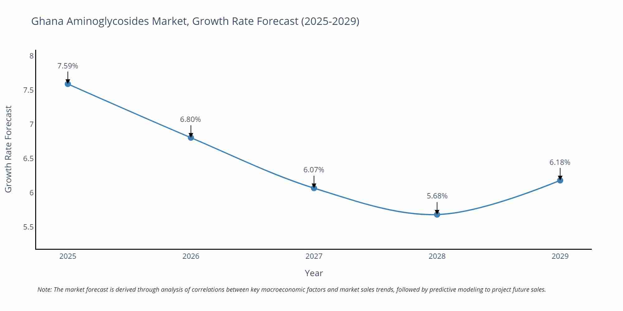 The Ghana Aminoglycosides Market is projected to witness mixed growth rate patterns during 2025 to 2029. Starting high at 7.59% in 2025, the market steadily declines to 6.18% by 2029.