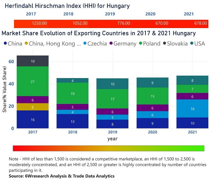In the year 2021, Czechia was the largest exporter in terms of value, followed by China. It has registered a growth of 227.8% over the previous year. While China registered a growth of 33.05% as compare to the previous year. In the year 2017 Poland was the largest exporter followed by China. In term of Herfindahl Index, which measures the competitiveness of countries exporting, Hungary has the Herfindahl index of 1250 in 2017 which signifies high competitiveness also in 2021 it registered a Herfindahl index of 678 which signifies high competitiveness in the market.
