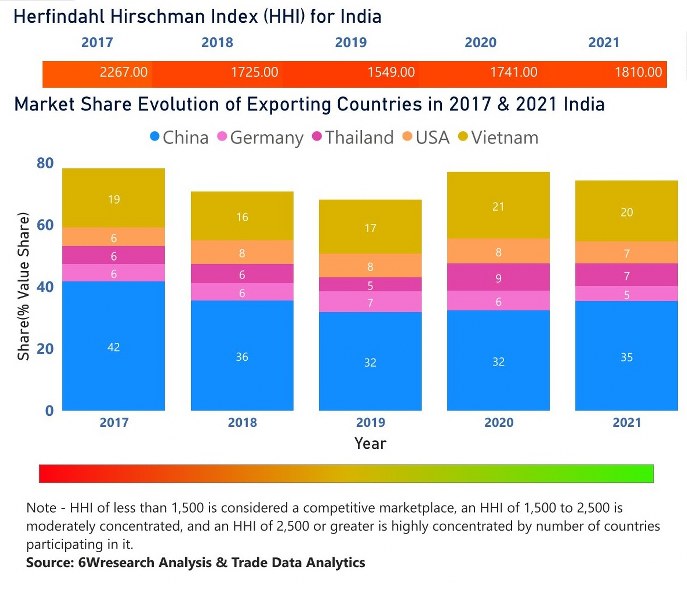 In the year 2021, China was the largest exporter in terms of value, followed by Viet Nam. It has registered a growth of 55.71% over the previous year. While Viet Nam registered a growth of 30.33% as compare to the previous year. In the year 2017 China was the largest exporter followed by Viet Nam. In term of Herfindahl Index, which measures the competitiveness of countries exporting, India has the Herfindahl index of 2267 in 2017 which signifies moderately concentrated also in 2021 it registered a Herfindahl index of 1810 which signifies moderately concentrated in the market.