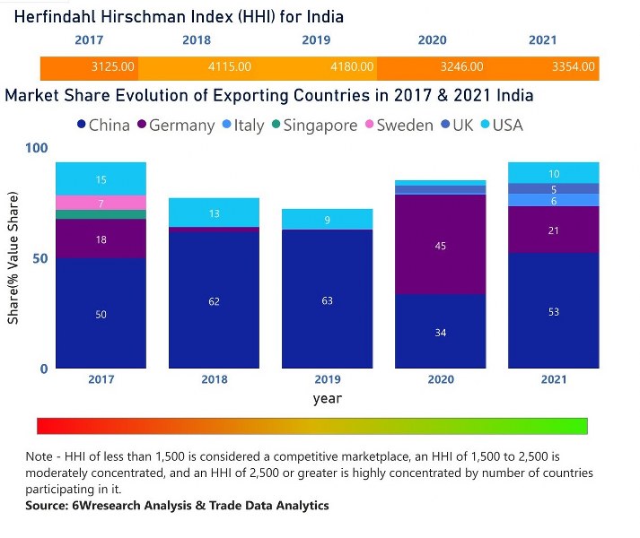 In the year 2021, China was the largest exporter in terms of value, followed by Germany. It has registered a growth of 36.67% over the previous year. While Germany registered a decline of -59.23% as compared to the previous year. In the year 2017, China was the largest exporter followed by Germany. In terms of the Herfindahl Index, which measures the competitiveness of countries exporting, India has a Herfindahl index of 3125 in 2017 which signifies high concentration also in 2021 it registered a Herfindahl index of 3354 which signifies high concentration in the market.