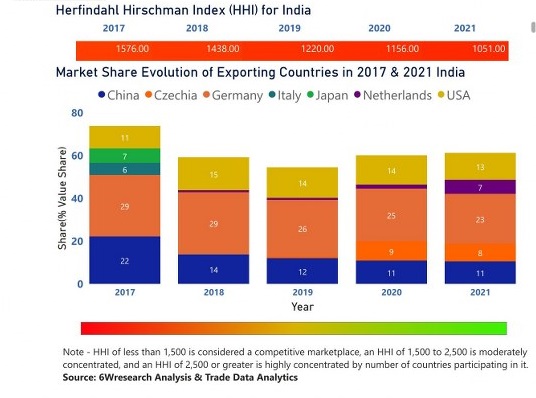 In the year 2021, Germany was the largest exporter in terms of value, followed by USA. It has registered a growth of 42.56% over the previous year. While USA registered a growth of 39.97% as compare to the previous year. In the year 2017 Germany was the largest exporter followed by China. In term of Herfindahl Index, which measures the competitiveness of countries exporting, India has the Herfindahl index of 1576 in 2017 which signifies moderately concentrated also in 2021 it registered a Herfindahl index of 1051 which signifies high competitiveness in the market.