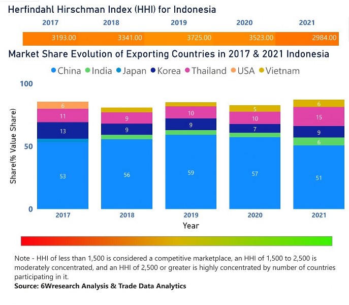 In the year 2021, China was the largest exporter in terms of value, followed by Thailand. It has registered a decline of -17.1% over the previous year. While Thailand registered a growth of 46.13% as compare to the previous year. In the year 2017 China was the largest exporter followed by Korea. In term of Herfindahl Index, which measures the competitiveness of countries exporting, Indonesia has the Herfindahl index of 3193 in 2017 which signifies high concentration also in 2021 it registered a Herfindahl index of 2984 which signifies high concentration in the market.