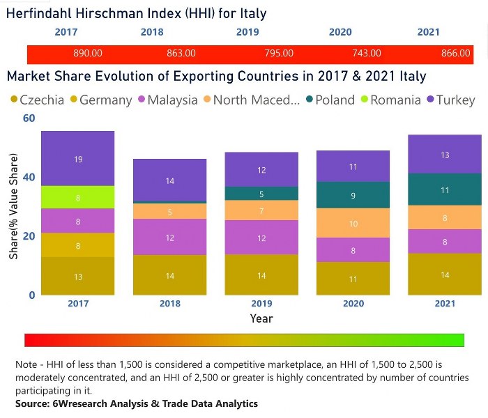 In the year 2021, Czechia was the largest exporter in terms of value, followed by Turkey. It has registered a growth of 73.4% over the previous year. While Turkey registered a growth of 70.54% as compare to the previous year. In the year 2017 Turkey was the largest exporter followed by Czechia. In term of Herfindahl Index, which measures the competitiveness of countries exporting, Italy has the Herfindahl index of 890 in 2017 which signifies high competitiveness also in 2021 it registered a Herfindahl index of 866 which signifies high competitiveness in the market.