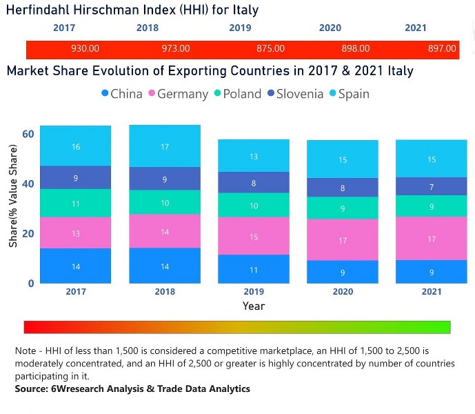 In the year 2021, Germany was the largest exporter in terms of value, followed by Spain. It has registered a growth of 28.5% over the previous year. While Spain registered a growth of 22.77% as compare to the previous year. In the year 2017 Spain was the largest exporter followed by China. In term of Herfindahl Index, which measures the competitiveness of countries exporting, Italy has the Herfindahl index of 930 in 2017 which signifies high competitiveness also in 2021 it registered a Herfindahl index of 897 which signifies high competitiveness in the market.