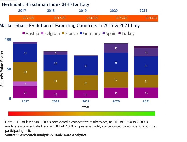 In the year 2021, Germany was the largest exporter in terms of value, followed by France. It has registered a growth of 27.22% over the previous year. While France registered a growth of 6.23% as compare to the previous year. In the year 2017 France was the largest exporter followed by Germany. In term of Herfindahl Index, which measures the competitiveness of countries exporting, Italy has the Herfindahl index of 2557 in 2017 which signifies high concentration also in 2021 it registered a Herfindahl index of 2013 which signifies moderately concentrated in the market.