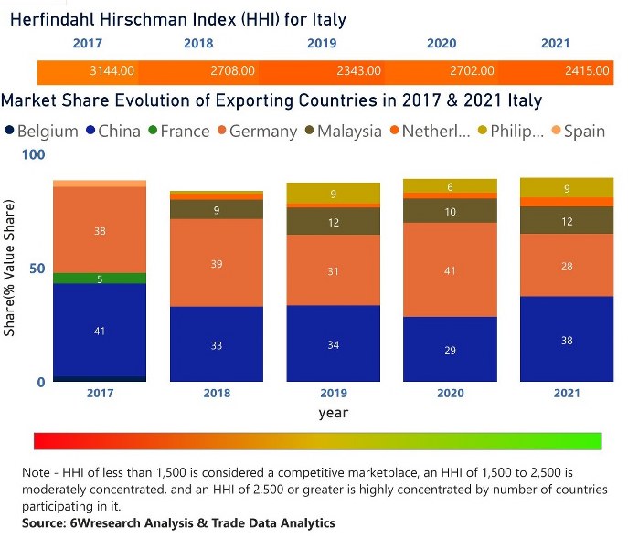 In the year 2021, China was the largest exporter in terms of value, followed by Germany. It has registered a growth of 55.22% over the previous year. While Germany registered a decline of -20.96% as compare to the previous year. In the year 2017 China was the largest exporter followed by Germany. In term of Herfindahl Index, which measures the competitiveness of countries exporting, Italy has the Herfindahl index of 3144 in 2017 which signifies high concentration also in 2021 it registered a Herfindahl index of 2415 which signifies moderately concentrated in the market.