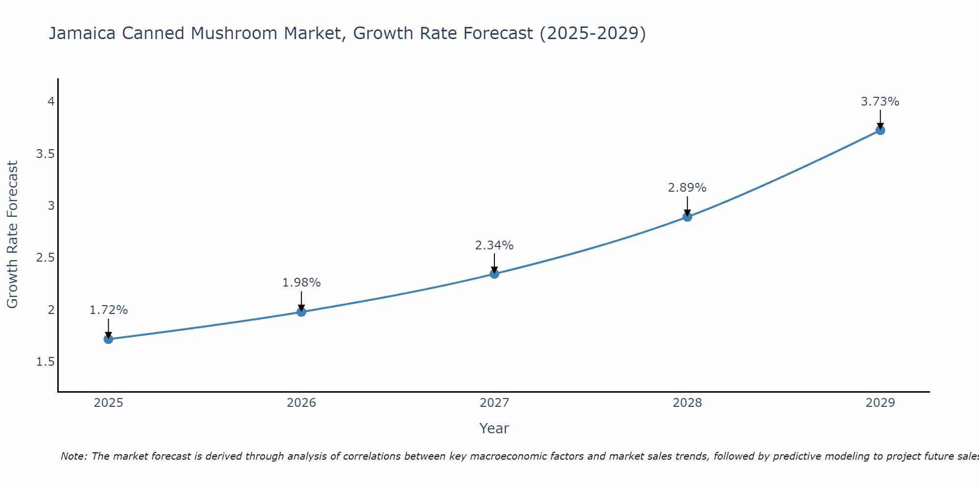 The Jamaica Canned Mushroom Market is likely to experience consistent growth rate gains over the period 2025 to 2029. The growth rate starts at 1.72% in 2025 and reaches 3.73% by 2029.