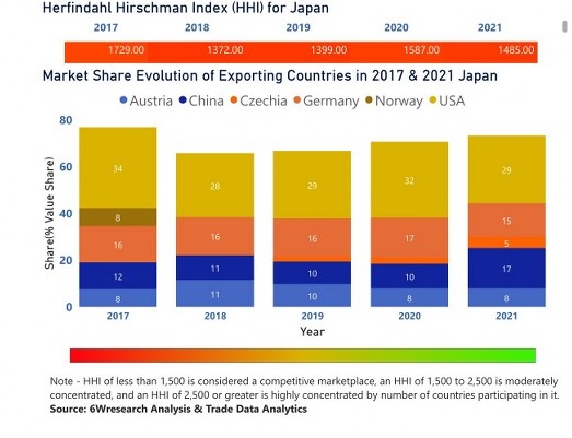 In the year 2021, USA was the largest exporter in terms of value, followed by China. It has registered a growth of 0.96% over the previous year. While China registered a growth of 86.83% as compare to the previous year. In the year 2017 USA was the largest exporter followed by Germany. In term of Herfindahl Index, which measures the competitiveness of countries exporting, Japan has the Herfindahl index of 1729 in 2017 which signifies moderately concentrated also in 2021 it registered a Herfindahl index of 1485 which signifies high competitiveness in the market.