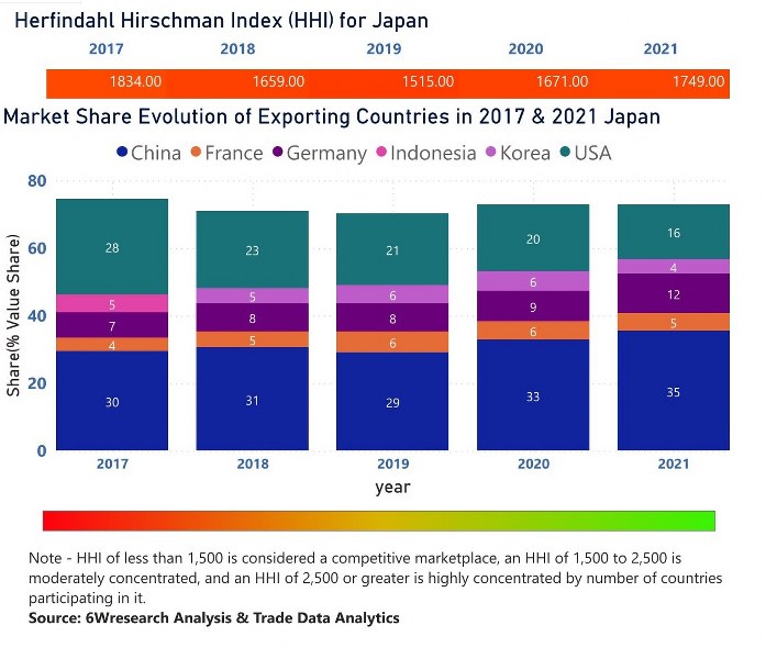 In the year 2021, China was the largest exporter in terms of value, followed by USA. It has registered a growth of 29.58% over the previous year. While USA registered a decline of -1.27% as compare to the previous year. In the year 2017 China was the largest exporter followed by USA. In term of Herfindahl Index, which measures the competitiveness of countries exporting, Japan has the Herfindahl index of 1834 in 2017 which signifies moderately concentrated also in 2021 it registered a Herfindahl index of 1749 which signifies moderately concentrated in the market.