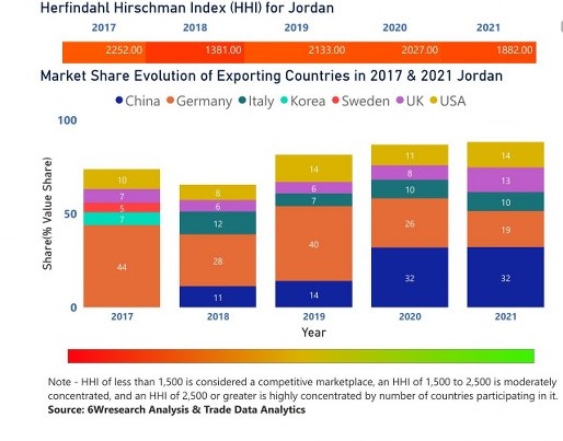 In the year 2021, China was the largest exporter in terms of value, followed by Germany. It has registered a growth of 36.89% over the previous year. While Germany registered a growth of 0.57% as compare to the previous year. In the year 2017 Germany was the largest exporter followed by USA. In term of Herfindahl Index, which measures the competitiveness of countries exporting, Jordan has the Herfindahl index of 2252 in 2017 which signifies moderately concentrated also in 2021 it registered a Herfindahl index of 1882 which signifies moderately concentrated in the market.