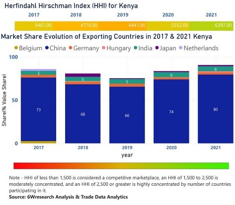 In the year 2021, China was the largest exporter in terms of value, followed by India. It has registered a growth of 35.27% over the previous year. While India registered a growth of 28.08% as compare to the previous year. In the year 2017 China was the largest exporter followed by India. In term of Herfindahl Index, which measures the competitiveness of countries exporting, Kenya has the Herfindahl index of 5461 in 2017 which signifies high concentration also in 2021 it registered a Herfindahl index of 6397 which signifies high concentration in the market.