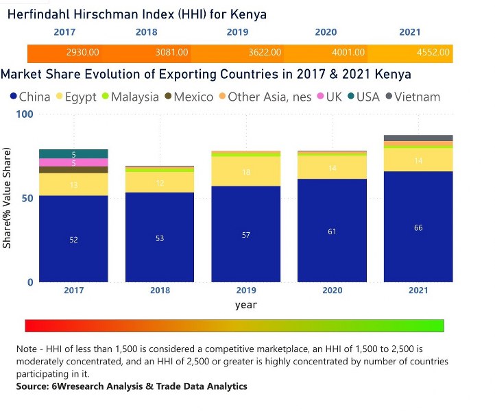 In the year 2021, China was the largest exporter in terms of value, followed by Egypt. It has registered a decline of -11.61% over the previous year. While Egypt registered a decline of -18.07% as compare to the previous year. In the year 2017 China was the largest exporter followed by Egypt. In term of Herfindahl Index, which measures the competitiveness of countries exporting, Kenya has the Herfindahl index of 2930 in 2017 which signifies high concentration also in 2021 it registered a Herfindahl index of 4552 which signifies high concentration in the market.