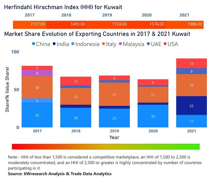 In the year 2021, Italy was the largest exporter in terms of value, followed by India. It has registered a decline of -84.96% over the previous year. While India registered a decline of -7.9% as compare to the previous year. In the year 2017 China was the largest exporter followed by Italy. In term of Herfindahl Index, which measures the competitiveness of countries exporting, Kuwait has the Herfindahl index of 2137 in 2017 which signifies moderately concentrated also in 2021 it registered a Herfindahl index of 1986 which signifies moderately concentrated in the market.