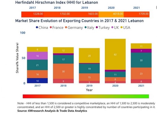 In the year 2021, Italy was the largest exporter in terms of value, followed by Germany. It has registered a growth of 63.67% over the previous year. While Germany registered a growth of 80.7% as compare to the previous year. In the year 2017 Italy was the largest exporter followed by Germany. In term of Herfindahl Index, which measures the competitiveness of countries exporting, Lebanon has the Herfindahl index of 1228 in 2017 which signifies high competitiveness also in 2021 it registered a Herfindahl index of 1709 which signifies moderately concentrated in the market.