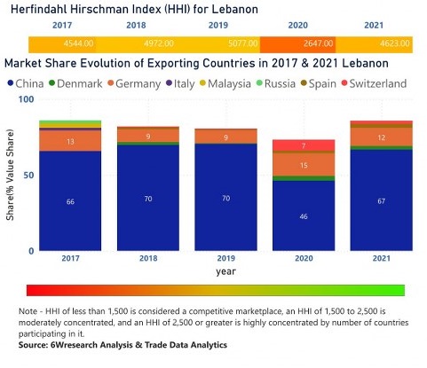 In the year 2021, China was the largest exporter in terms of value, followed by Germany. It has registered a growth of 260.35% over the previous year. While Germany registered a growth of 97.09% as compare to the previous year. In the year 2017 China was the largest exporter followed by Germany. In term of Herfindahl Index, which measures the competitiveness of countries exporting, Lebanon has the Herfindahl index of 4544 in 2017 which signifies high concentration also in 2021 it registered a Herfindahl index of 4623 which signifies high concentration in the market.