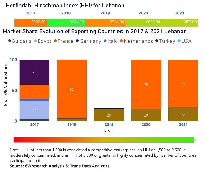 In the year 2021, Netherlands was the largest exporter in terms of value, followed by France. It has registered a decline of -48.87% over the previous year. While France registered a decline of -43.84% as compare to the previous year. In the year 2017 Turkey was the largest exporter followed by Egypt. In term of Herfindahl Index, which measures the competitiveness of countries exporting, Lebanon has the Herfindahl index of 3002 in 2017 which signifies high concentration also in 2021 it registered a Herfindahl index of 6457 which signifies high concentration in the market.