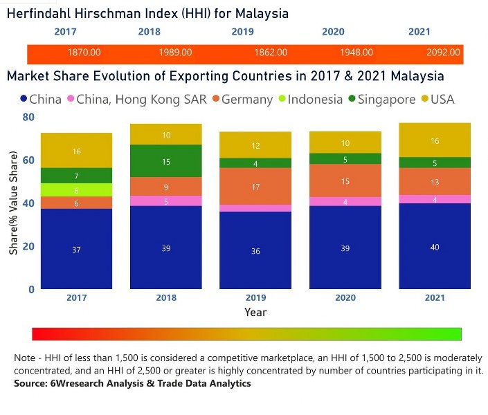 In the year 2021, China was the largest exporter in terms of value, followed by USA. It has registered a growth of 46.34% over the previous year. While USA registered a growth of 120.98% as compare to the previous year. In the year 2017 China was the largest exporter followed by USA. In term of Herfindahl Index, which measures the competitiveness of countries exporting, Malaysia has the Herfindahl index of 1870 in 2017 which signifies moderately concentrated also in 2021 it registered a Herfindahl index of 2092 which signifies moderately concentrated in the market.