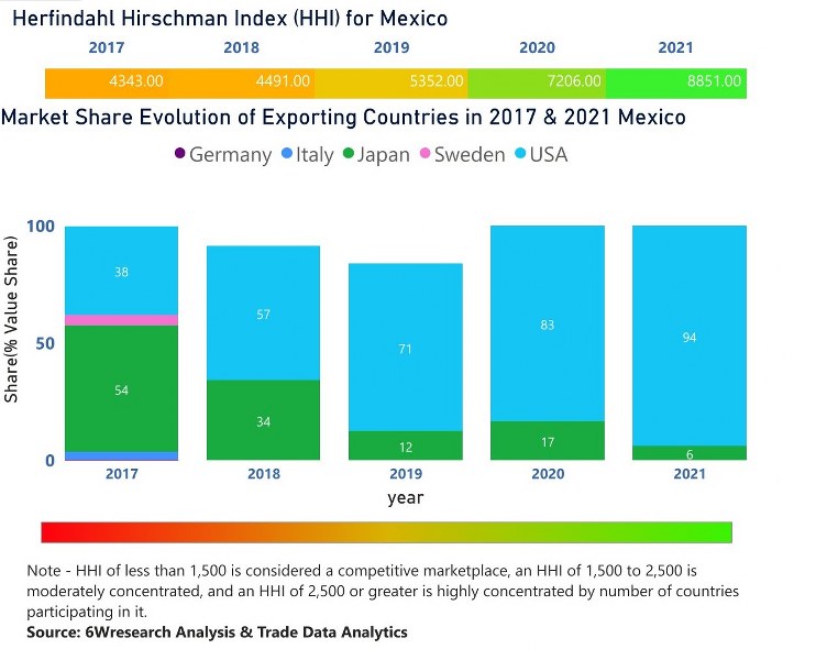 In the year 2021, USA was the largest exporter in terms of value, followed by Japan. It has registered a decline of -0.72% over the previous year. While Japan registered a decline of -67.92% as compare to the previous year. In the year 2017 Japan was the largest exporter followed by USA. In term of Herfindahl Index, which measures the competitiveness of countries exporting, Mexico has the Herfindahl index of 4343 in 2017 which signifies high concentration also in 2021 it registered a Herfindahl index of 8851 which signifies high concentration in the market.