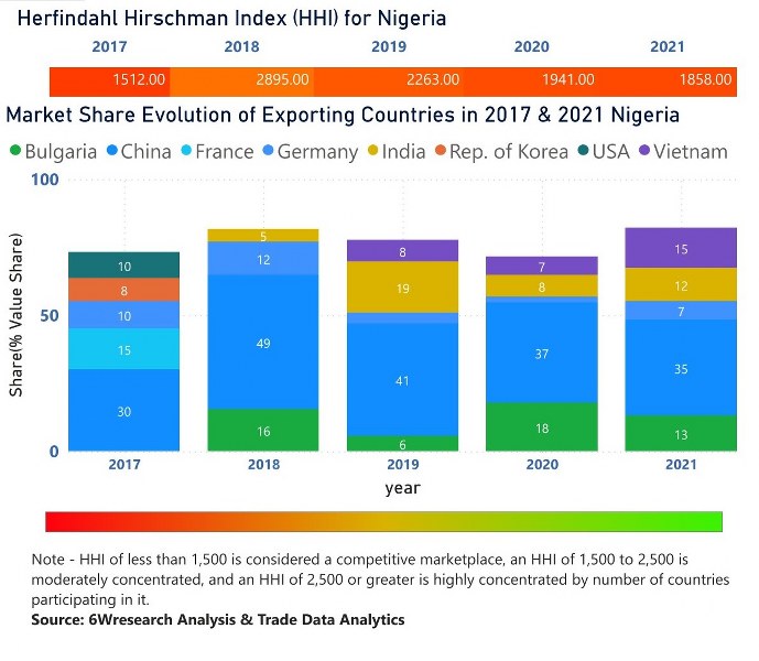In the year 2021, Spain was the largest exporter in terms of value, followed by Turkey. It has registered a decline of -12.53% over the previous year. While Turkey registered a growth of 94.83% as compare to the previous year. In the year 2017 Spain was the largest exporter followed by China. In term of Herfindahl Index, which measures the competitiveness of countries exporting, Morocco has the Herfindahl index of 3775 in 2017 which signifies high concentration also in 2021 it registered a Herfindahl index of 2702 which signifies high concentration in the market.
