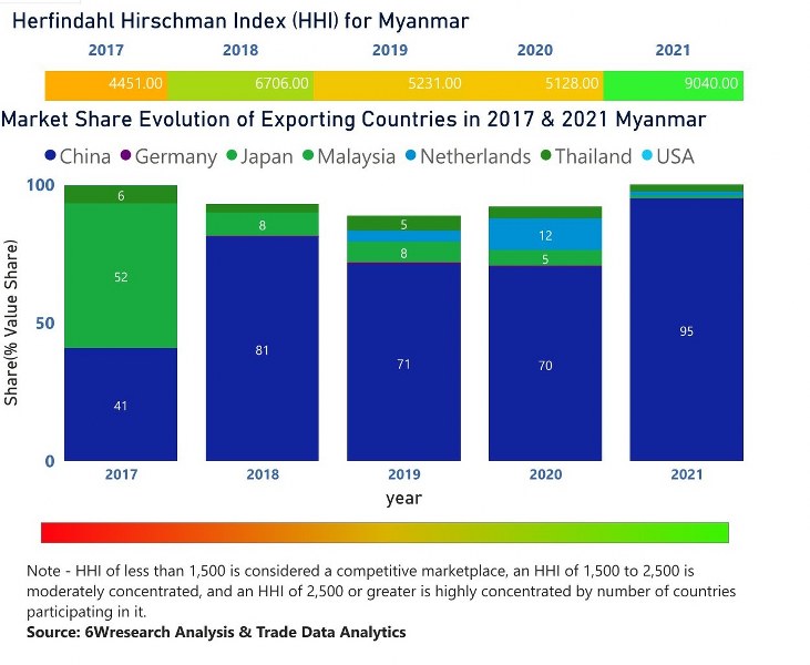 In the year 2021, China was the largest exporter in terms of value, followed by Thailand. It has registered a growth of 137% over the previous year. While Thailand registered a growth of 9.12% as compare to the previous year. In the year 2017 Japan was the largest exporter followed by China. In term of Herfindahl Index, which measures the competitiveness of countries exporting, Myanmar has the Herfindahl index of 4451 in 2017 which signifies high concentration also in 2021 it registered a Herfindahl index of 9040 which signifies high concentration in the market.