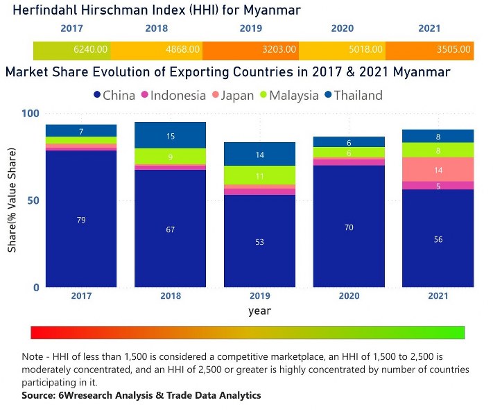 In the year 2021, China was the largest exporter in terms of value, followed by Japan. It has registered a decline of -59.53% over the previous year. While Japan registered a growth of 607.88% as compare to the previous year. In the year 2017 China was the largest exporter followed by Thailand. In term of Herfindahl Index, which measures the competitiveness of countries exporting, Myanmar has the Herfindahl index of 6240 in 2017 which signifies high concentration also in 2021 it registered a Herfindahl index of 3505 which signifies high concentration in the market.