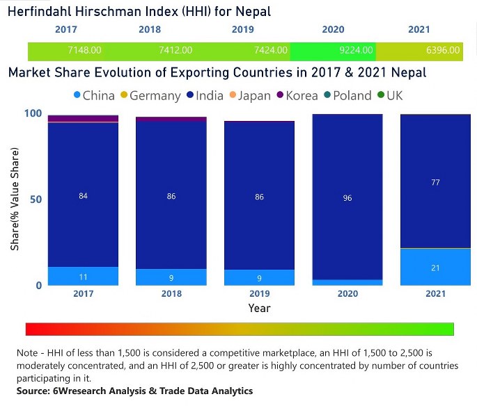 In the year 2021, India was the largest exporter in terms of value, followed by China. It has registered a growth of 28.99% over the previous year. While China registered a growth of 954.96% as compare to the previous year. In the year 2017 India was the largest exporter followed by China. In term of Herfindahl Index, which measures the competitiveness of countries exporting, Nepal has the Herfindahl index of 7148 in 2017 which signifies high concentration also in 2021 it registered a Herfindahl index of 6396 which signifies high concentration in the market.
