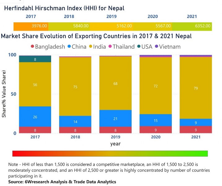 In the year 2021, India was the largest exporter in terms of value, followed by China. It has registered a growth of 42.73% over the previous year. While China registered a decline of -20.8% as compare to the previous year. In the year 2017 India was the largest exporter followed by China. In term of Herfindahl Index, which measures the competitiveness of countries exporting, Nepal has the Herfindahl index of 3976 in 2017 which signifies high concentration also in 2021 it registered a Herfindahl index of 6352 which signifies high concentration in the market.