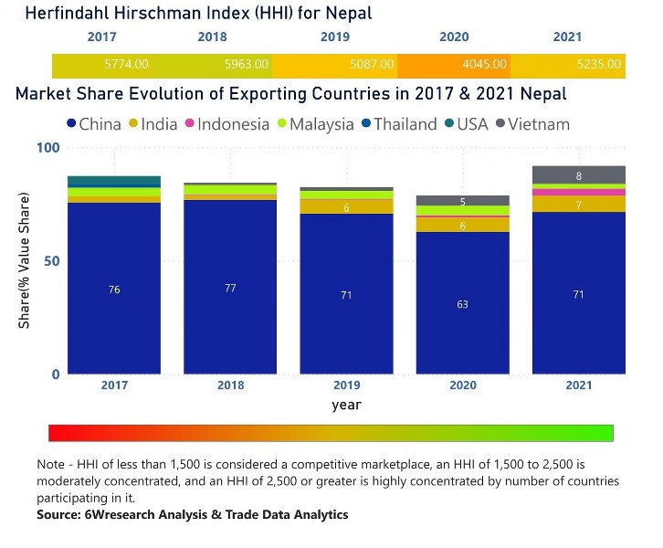 In the year 2021, China was the largest exporter in terms of value, followed by Viet Nam. It has registered a growth of 104.21% over the previous year. While Viet Nam registered a growth of 207.02% as compare to the previous year. In the year 2017 China was the largest exporter followed by Malaysia. In term of Herfindahl Index, which measures the competitiveness of countries exporting, Nepal has the Herfindahl index of 5774 in 2017 which signifies high concentration also in 2021 it registered a Herfindahl index of 5235 which signifies high concentration in the market.