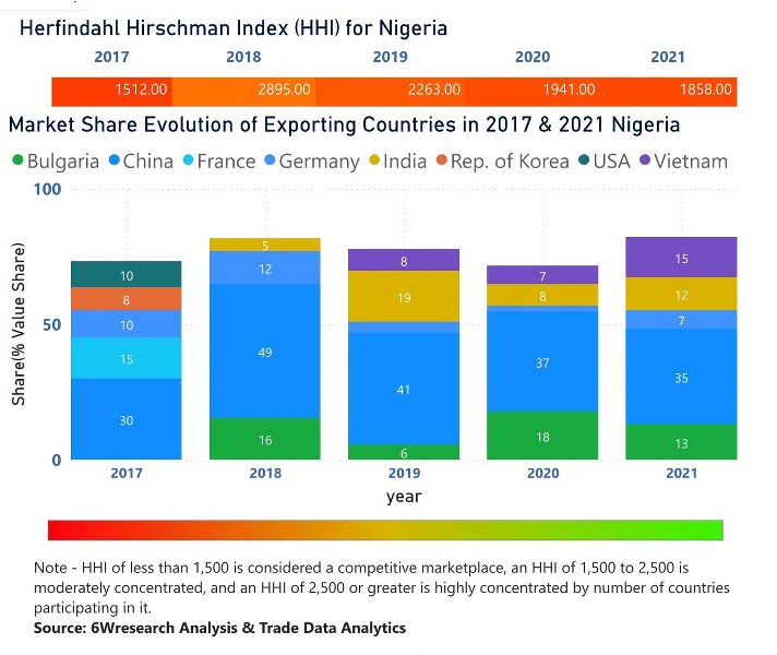 In the year 2021, China was the largest exporter in terms of value, followed by Viet Nam. It has registered a decline of -46.01% over the previous year. While Viet Nam registered a growth of 23% as compare to the previous year. In the year 2017 China was the largest exporter followed by France. In term of Herfindahl Index, which measures the competitiveness of countries exporting, Nigeria has the Herfindahl index of 1512 in 2017 which signifies moderately concentrated also in 2021 it registered a Herfindahl index of 1858 which signifies moderately concentrated in the market.