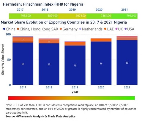 In the year 2021, China was the largest exporter in terms of value, followed by Germany. It has registered a decline of -50.1% over the previous year. While Germany registered a decline of -22.29% as compare to the previous year. In the year 2017 China was the largest exporter followed by Germany. In term of Herfindahl Index, which measures the competitiveness of countries exporting, Nigeria has the Herfindahl index of 7052 in 2017 which signifies high concentration also in 2021 it registered a Herfindahl index of 7912 which signifies high concentration in the market.