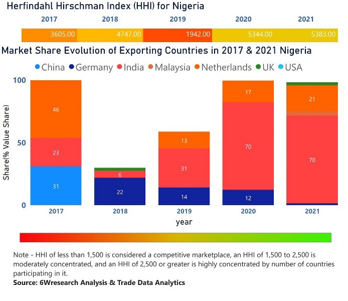 In the year 2021, India was the largest exporter in terms of value, followed by the Netherlands. It has registered a growth of 153.09% over the previous year. While the Netherlands registered a growth of 206.76% as compared to the previous year. In the year 2017, the Netherlands was the largest exporter followed by China. In terms of the Herfindahl Index, which measures the competitiveness of countries exporting, Nigeria has a Herfindahl index of 3605 in 2017 which signifies high concentration also in 2021 it registered a Herfindahl index of 5383 which signifies high concentration in the market.