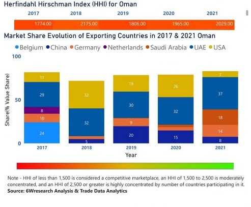 In the year 2021, UAE was the largest exporter in terms of value, followed by Saudi Arabia. It has registered a decline of -9.13% over the previous year. While Saudi Arabia registered a growth of 381.17% as compare to the previous year. In the year 2017 UAE was the largest exporter followed by Belgium. In term of Herfindahl Index, which measures the competitiveness of countries exporting, Oman has the Herfindahl index of 1774 in 2017 which signifies moderately concentrated also in 2021 it registered a Herfindahl index of 2029 which signifies moderately concentrated in the market.