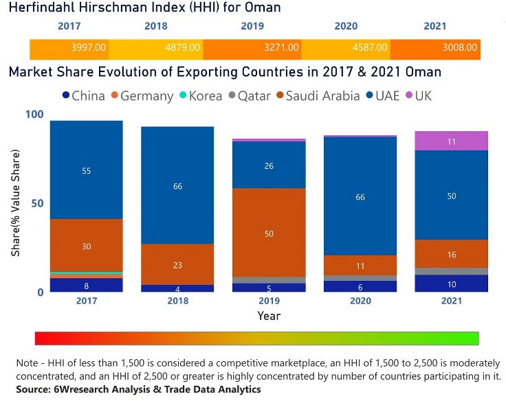 In the year 2021, UAE was the largest exporter in terms of value, followed by Saudi Arabia. It has registered a decline of -58.27% over the previous year. While Saudi Arabia registered a decline of -22.67% as compare to the previous year. In the year 2017 UAE was the largest exporter followed by Saudi Arabia. In term of Herfindahl Index, which measures the competitiveness of countries exporting, Oman has the Herfindahl index of 3997 in 2017 which signifies high concentration also in 2021 it registered a Herfindahl index of 3008 which signifies high concentration in the market.