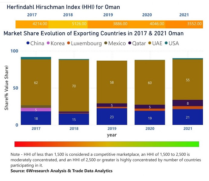 In the year 2021, UAE was the largest exporter in terms of value, followed by China. It has registered a decline of -1.22% over the previous year. While China registered a growth of 21.3% as compare to the previous year. In the year 2017 UAE was the largest exporter followed by China. In term of Herfindahl Index, which measures the competitiveness of countries exporting, Oman has the Herfindahl index of 4214 in 2017 which signifies high concentration also in 2021 it registered a Herfindahl index of 3552 which signifies high concentration in the market.