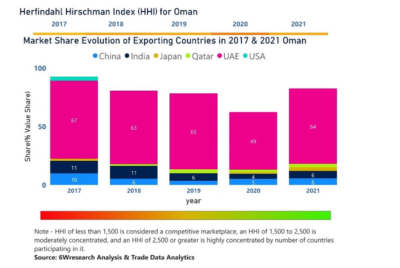 In the year 2021, UAE was the largest exporter in terms of value, followed by India. It has registered a decline of -16.21% over the previous year. While India registered a decline of -9.49% as compare to the previous year. In the year 2017 UAE was the largest exporter followed by India. In term of Herfindahl Index, which measures the competitiveness of countries exporting, Oman has the Herfindahl index of 4677 in 2017 which signifies high concentration also in 2021 it registered a Herfindahl index of 4269 which signifies high concentration in the market.