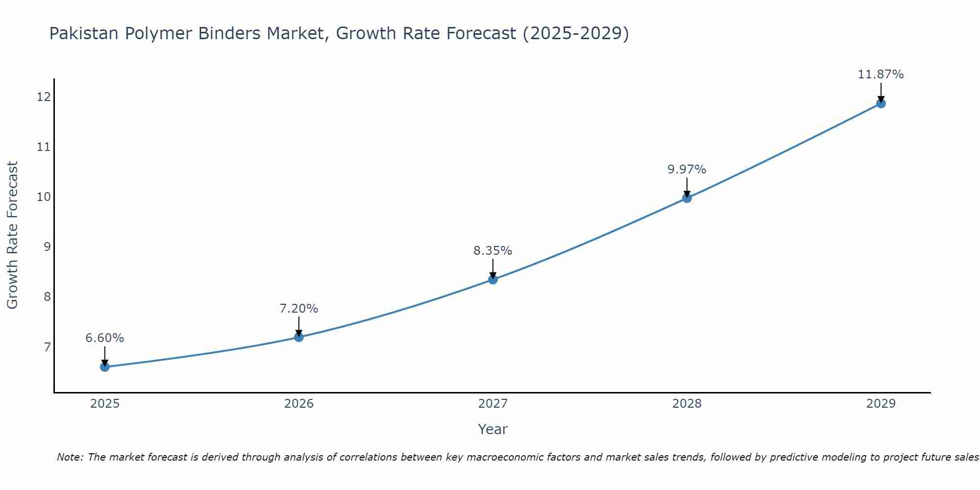 The Pakistan Polymer Binders Market is poised for steady growth rate improvements from 2025 to 2029. Commencing at 6.60% in 2025, growth builds up to 11.87% by 2029.