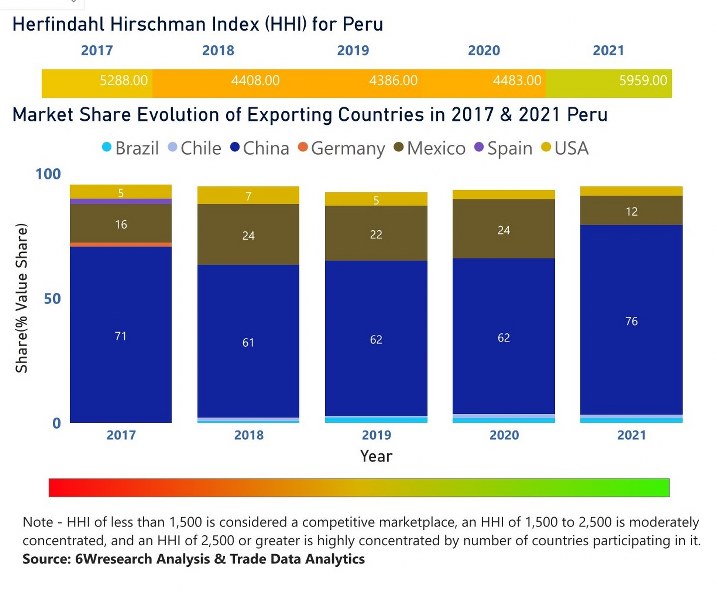 In the year 2021, China was the largest exporter in terms of value, followed by Mexico. It has registered a growth of 90.35% over the previous year. While Mexico registered a decline of -22.81% as compare to the previous year. In the year 2017 China was the largest exporter followed by Mexico. In term of Herfindahl Index, which measures the competitiveness of countries exporting, Peru has the Herfindahl index of 5288 in 2017 which signifies high concentration also in 2021 it registered a Herfindahl index of 5959 which signifies high concentration in the market.