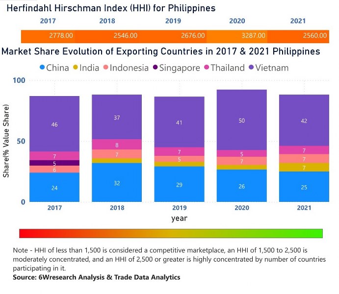 In the year 2021, Viet Nam was the largest exporter in terms of value, followed by China. It has registered a decline of -8.57% over the previous year. While China registered a growth of 2.16% as compare to the previous year. In the year 2017 Viet Nam was the largest exporter followed by China. In term of Herfindahl Index, which measures the competitiveness of countries exporting, Philippines has the Herfindahl index of 2778 in 2017 which signifies high concentration also in 2021 it registered a Herfindahl index of 2560 which signifies high concentration in the market.