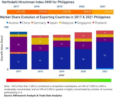 In the year 2021, China was the largest exporter in terms of value, followed by Japan. It has registered a growth of 62.61% over the previous year. While Japan registered a decline of -23.28% as compare to the previous year. In the year 2017 China was the largest exporter followed by Japan. In term of Herfindahl Index, which measures the competitiveness of countries exporting, Philippines has the Herfindahl index of 2751 in 2017 which signifies high concentration also in 2021 it registered a Herfindahl index of 4163 which signifies high concentration in the market.