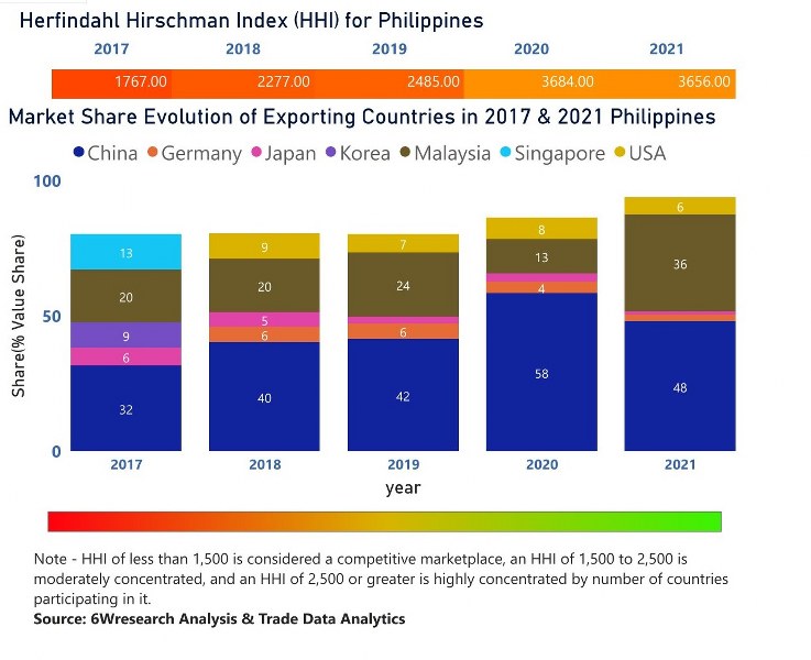 In the year 2021, China was the largest exporter in terms of value, followed by Malaysia. It has registered a growth of 48.11% over the previous year. While Malaysia registered a growth of 415.84% as compared to the previous year. In the year 2017, China was the largest exporter followed by Malaysia. In terms of the Herfindahl Index, which measures the competitiveness of countries exporting, the Philippines has a Herfindahl index of 1767 in 2017 which signifies moderately concentrated also in 2021 it registered a Herfindahl index of 3656 which signifies high concentration in the market.