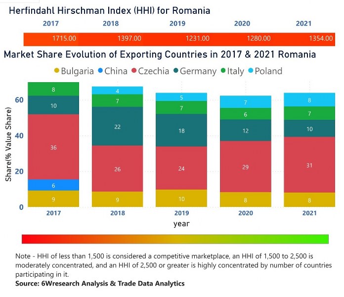 In the year 2021, Czechia was the largest exporter in terms of value, followed by Germany. It has registered a growth of 37.46% over the previous year. While Germany registered a growth of 3.72% as compare to the previous year. In the year 2017 Czechia was the largest exporter followed by Germany. In term of Herfindahl Index, which measures the competitiveness of countries exporting, Romania has the Herfindahl index of 1715 in 2017 which signifies moderately concentrated also in 2021 it registered a Herfindahl index of 1354 which signifies high competitiveness in the market.