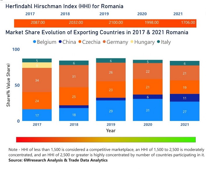In the year 2021, Belgium was the largest exporter in terms of value, followed by Germany. It has registered a decline of -9.84% over the previous year. While Germany registered a decline of -3.62% as compare to the previous year. In the year 2017 Germany was the largest exporter followed by Czechia. In term of Herfindahl Index, which measures the competitiveness of countries exporting, Romania has the Herfindahl index of 2087 in 2017 which signifies moderately concentrated also in 2021 it registered a Herfindahl index of 1706 which signifies moderately concentrated in the market.
