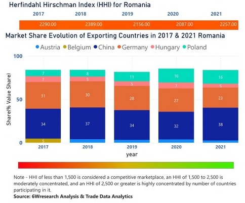 In the year 2021, China was the largest exporter in terms of value, followed by Germany. It has registered a growth of 72% over the previous year. While Germany registered a growth of 25.69% as compare to the previous year. In the year 2017 China was the largest exporter followed by Germany. In term of Herfindahl Index, which measures the competitiveness of countries exporting, Romania has the Herfindahl index of 2290 in 2017 which signifies moderately concentrated also in 2021 it registered a Herfindahl index of 2257 which signifies moderately concentrated in the market.