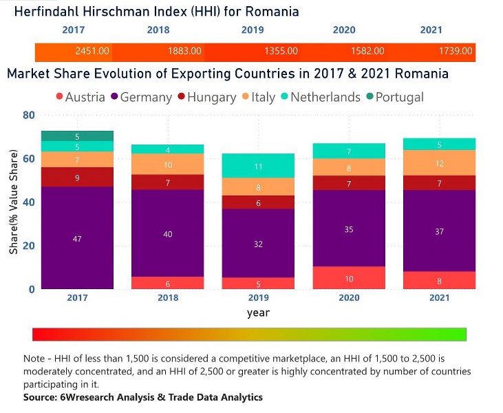 In the year 2021, Germany was the largest exporter in terms of value, followed by Italy. It has registered a growth of 23.44% over the previous year. While Italy registered a growth of 69.92% as compare to the previous year. In the year 2017 Germany was the largest exporter followed by Hungary. In term of Herfindahl Index, which measures the competitiveness of countries exporting, Romania has the Herfindahl index of 2451 in 2017 which signifies moderately concentrated also in 2021 it registered a Herfindahl index of 1739 which signifies moderately concentrated in the market.