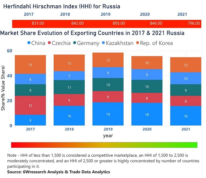 In the year 2021, China was the largest exporter in terms of value, followed by Korea. It has registered a growth of 11.27% over the previous year. While Korea registered a growth of 49.38% as compare to the previous year. In the year 2017 Czechia was the largest exporter followed by Korea. In term of Herfindahl Index, which measures the competitiveness of countries exporting, Russia has the Herfindahl index of 831 in 2017 which signifies high competitiveness also in 2021 it registered a Herfindahl index of 796 which signifies high competitiveness in the market.