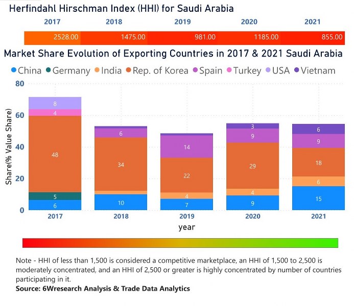 In the year 2021, Korea was the largest exporter in terms of value, followed by China. It has registered a decline of -27.13% over the previous year. While China registered a growth of 89.17% as compare to the previous year. In the year 2017 Korea was the largest exporter followed by USA. In term of Herfindahl Index, which measures the competitiveness of countries exporting, Saudi Arabia has the Herfindahl index of 2528 in 2017 which signifies high concentration also in 2021 it registered a Herfindahl index of 855 which signifies high competitiveness in the market.