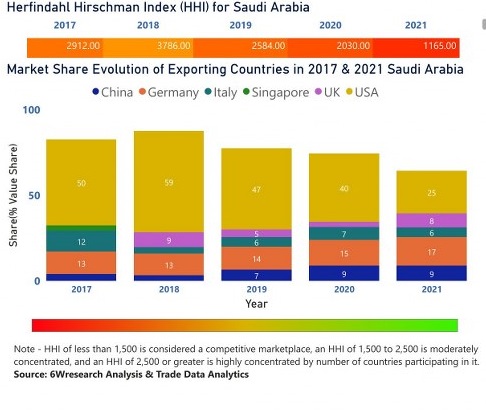 In the year 2021, USA was the largest exporter in terms of value, followed by Germany. It has registered a decline of -45.8% over the previous year. While Germany registered a decline of -2.41% as compare to the previous year. In the year 2017 USA was the largest exporter followed by Germany. In term of Herfindahl Index, which measures the competitiveness of countries exporting, Saudi Arabia has a Herfindahl index of 2912 in 2017 which signifies high concentration also in 2021 it registered a Herfindahl index of 1165 which signifies high competitiveness in the market.