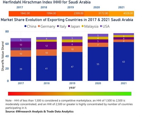 In the year 2021, China was the largest exporter in terms of value, followed by Germany. It has registered a growth of 26.86% over the previous year. While Germany registered a decline of -32.24% as compare to the previous year. In the year 2017 China was the largest exporter followed by Germany. In term of Herfindahl Index, which measures the competitiveness of countries exporting, Saudi Arabia has the Herfindahl index of 1842 in 2017 which signifies moderately concentrated also in 2021 it registered a Herfindahl index of 4028 which signifies high concentration in the market.