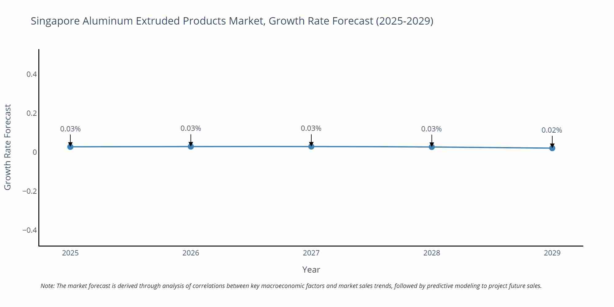 The Singapore Aluminum Extruded Products Market is projected to witness mixed growth rate patterns during 2025 to 2029. The growth rate begins at 0.03% in 2025, climbs to a high of 0.03% in 2027, and moderates to 0.02% by 2029.
