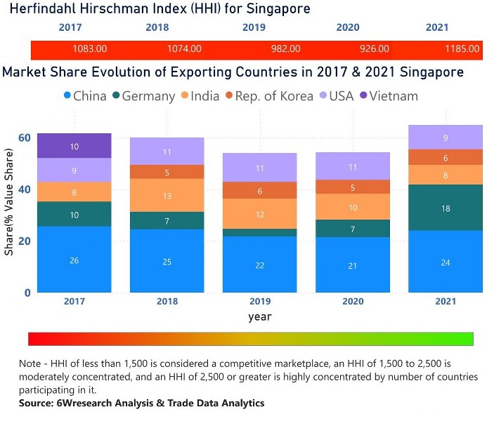 In the year 2021, China was the largest exporter in terms of value, followed by Germany. It has registered a growth of 31.15% over the previous year. While Germany registered a growth of 205.75% as compare to the previous year. In the year 2017 China was the largest exporter followed by Viet Nam. In term of Herfindahl Index, which measures the competitiveness of countries exporting, Singapore has the Herfindahl index of 1083 in 2017 which signifies high competitiveness also in 2021 it registered a Herfindahl index of 1185 which signifies high competitiveness in the market.